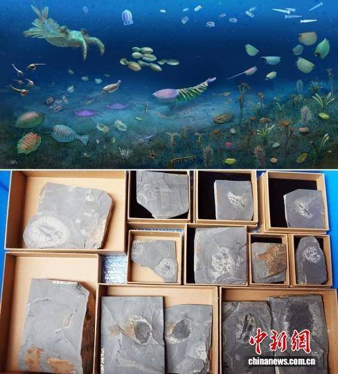 花垣生物群生态复原图(上图)杨定华 绘制;花垣生物群部分化石展示。中新网记者 孙自法 摄